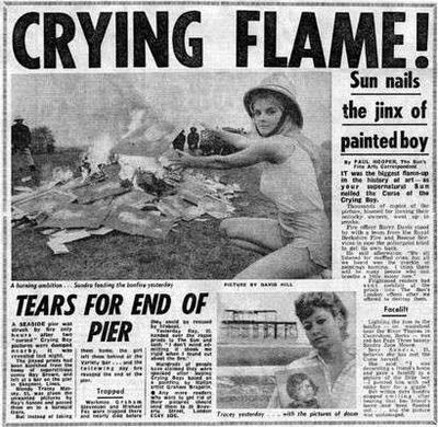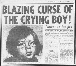 O tabloide Sun, e em particular, seu editor Kelvin MacKenzie, publicaram uma nota em 4 de setembro de 1985, bradando a “Flamejante Maldição do Garoto em Lágrimas", alegando que a “pintura é a causa de incêndios", o Sun conseguiu criar um frenesi popular em torno da lenda.