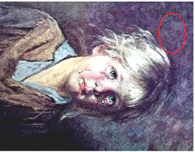 Quadro 3: Pode-se ver claramente a falta de um braço, sutilmente escondido pela manta de carmim que cobrem os ombros. Também percebe-se que o braço da menina deveria ser demasiadamente grande para encontrar-se com seu cotovelo, visto que o antebraço se posiciona de forma totalmente incoerente. Após estas avaliações, infere-se que esta menina esteja esquartejada e que seu braço esquerdo esteja jogado por sobre seu corpo, ou ela foi morta e carregada por um braço de um homem como um tipo de “encomenda”. Também pode-se notar que, o que parece ser gotas de sangue escorrendo, na verdade é sua manta desfiando.
